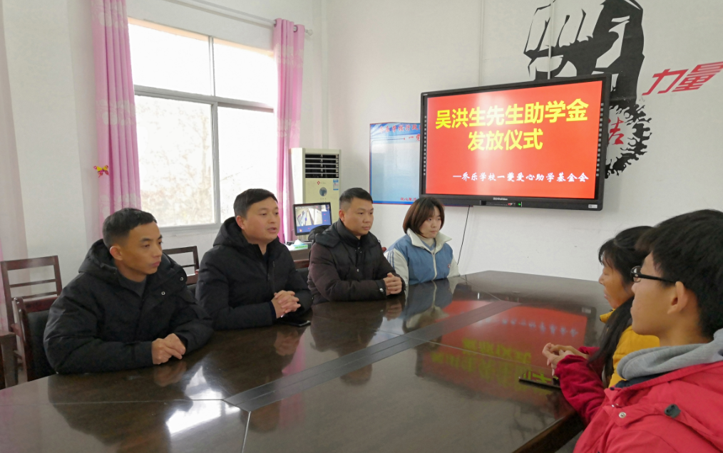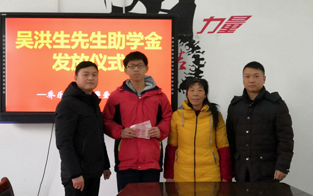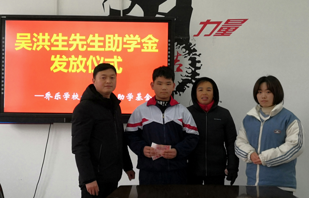 2020年12月18日,广东骏达物流有限公司吴洪生先生助学金发放仪式在乔乐学校中学部举行,乔乐学校一夔爱心助学基金会杨润根校长受吴先生委托,向受助学生发放了2000元资助金,胡家洗、刘杨芳副校长、两位班主任及受助家长参加发放仪式。
