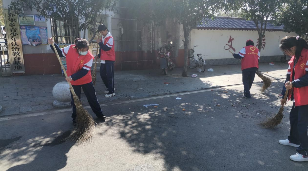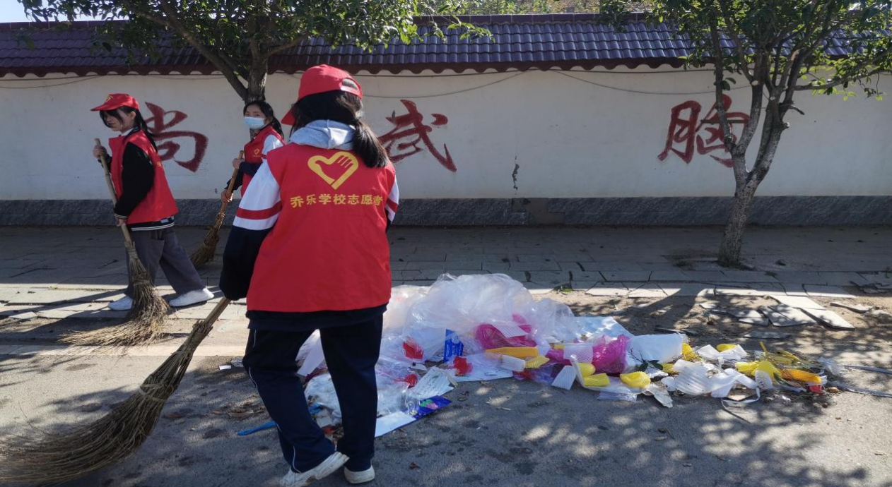 清晨,校园外的大街上,便已熙熙攘攘、摩肩接踵,骑电车的、开三轮的......吆喝声、说笑声、讨价还价声此起彼伏、不绝于耳,热闹非凡。中午时分,人流已散,商贩们也都已收摊回家,街道上只剩下众多食物的“外衣”,乔乐学校的团员青年们走上了街头清扫垃圾。在活动中,10多名志愿者从学校门口开始,沿着这条街道一路清扫到马路交叉口路段。一中午的时间,孩子们用辛勤的劳动,使街道的环境焕然一新。