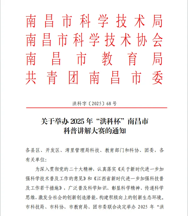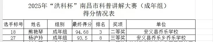 在2025年4月26日举办的南昌市科普讲解大赛中,我校熊艳琴、杨沪玲老师,从32名选手中脱颖而出,分别获第三,第八名,荣获二,三等奖。熊艳琴老师更是凭借优异表现,获得成功晋级省赛的资格!