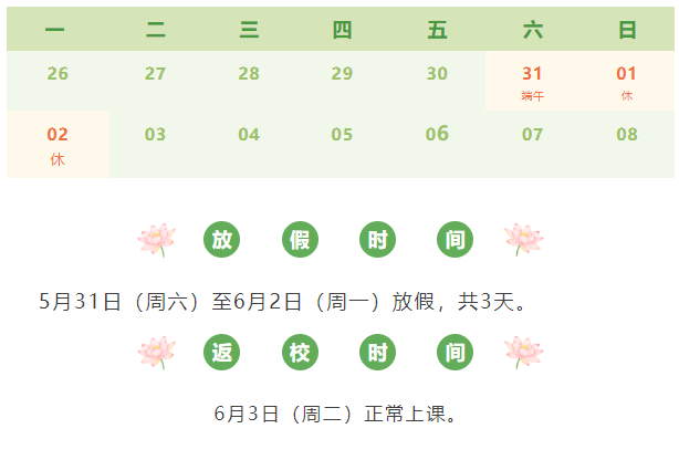 尊敬的家长朋友: 您好!粽叶飘香,端午节假期即将来临,为了让孩子们度过一个愉快的端午假期,现根据《国务院办公厅关于2025年部分节假日安排的通知》的规定,将端午节放假安排及注意事项通知如下: