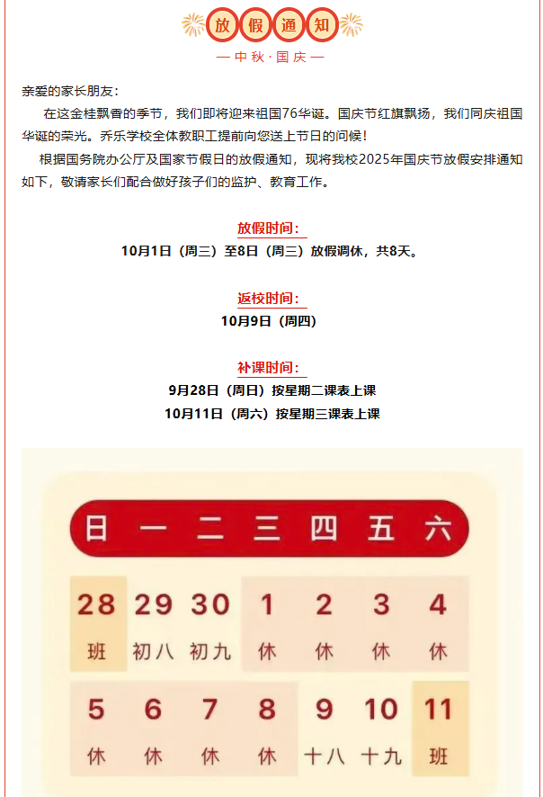 乔乐学校2025年国庆中秋放假通知