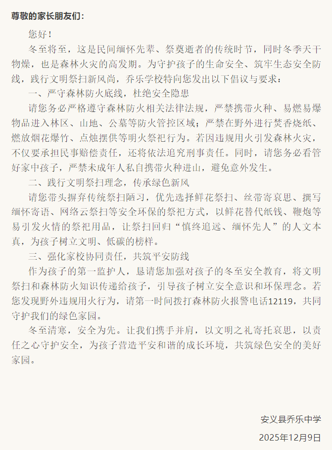 乔乐中学关于冬至期间文明祭扫及森林防火致家长的一封信