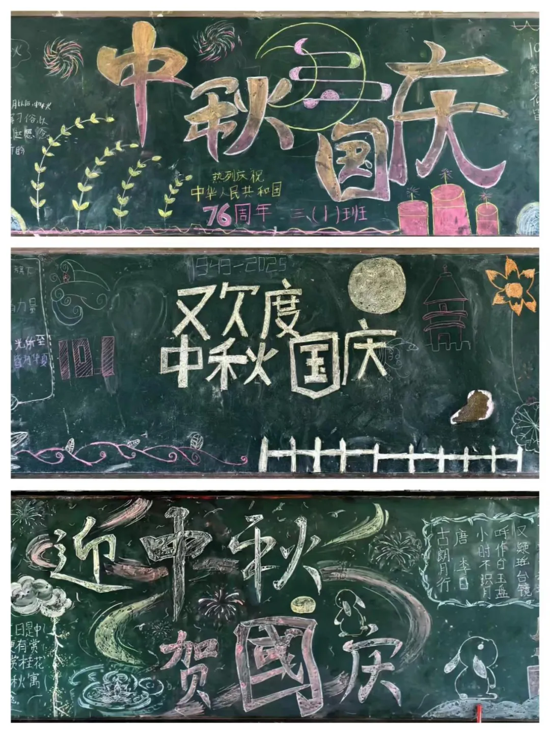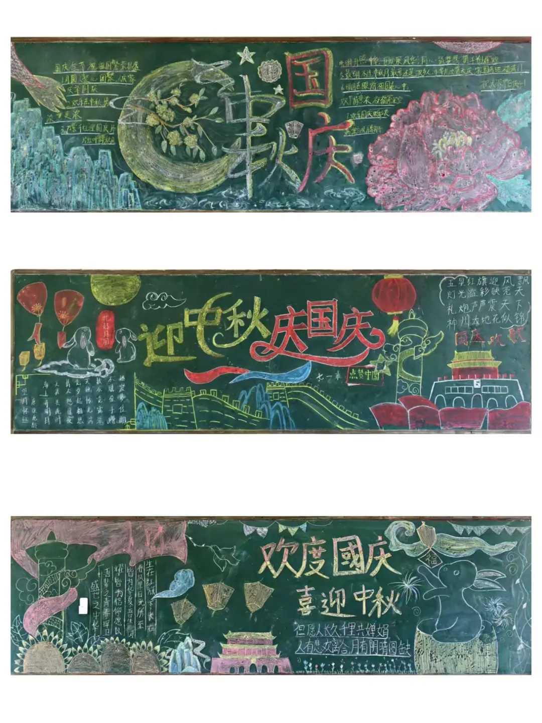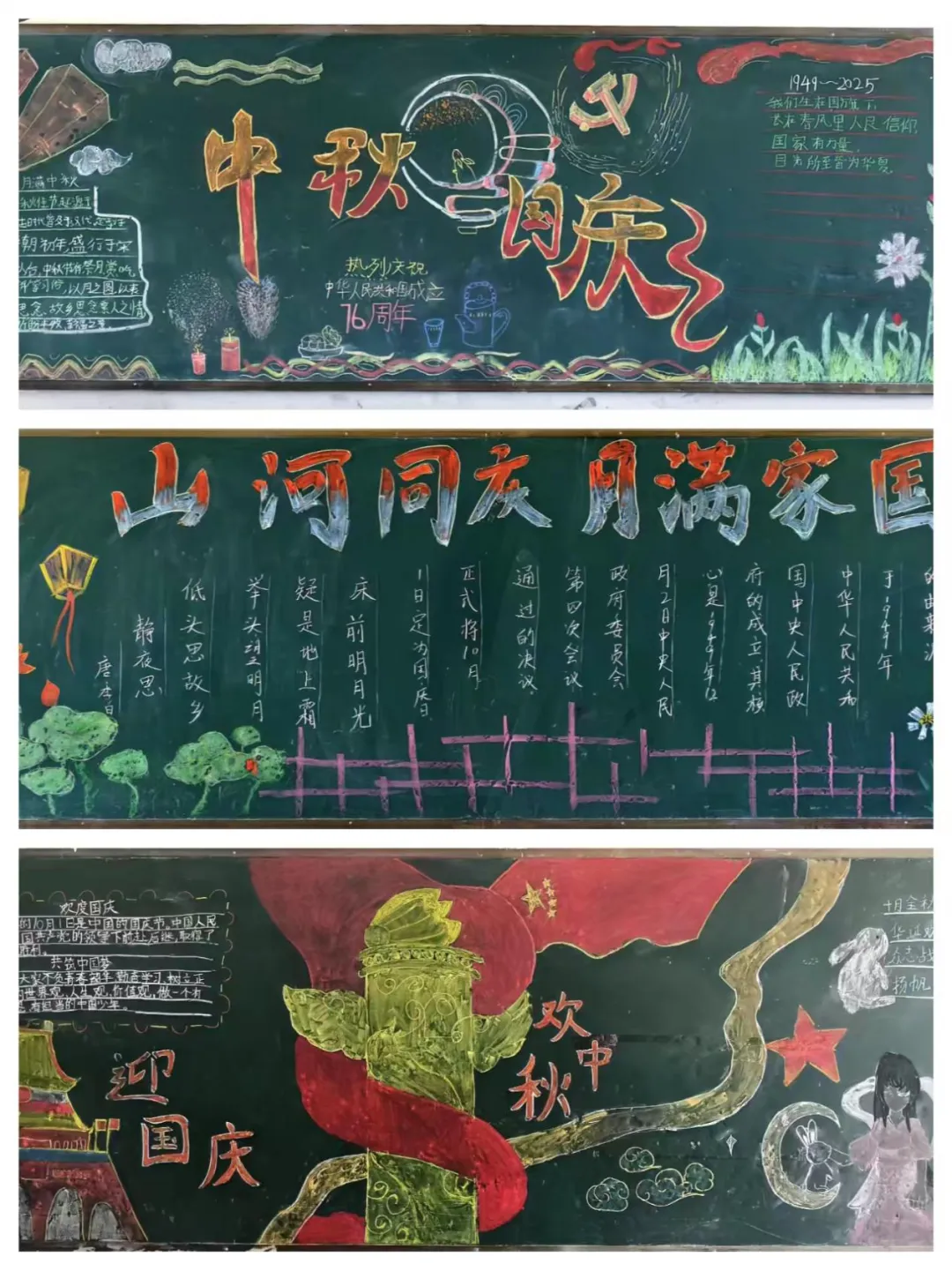各班师生围绕“国庆+中秋”双主题,将家国情怀与传统韵味融入创作。有的班级侧重文化内涵挖掘:在版面中嵌入《静夜思》《古朗月行》等中秋诗词,搭配国庆历史知识科普,让黑板报成为文化“小课堂”。有的班级以天安门、长城、红色灯笼与金色五星点缀其间,尽显家国同庆的热烈氛围。