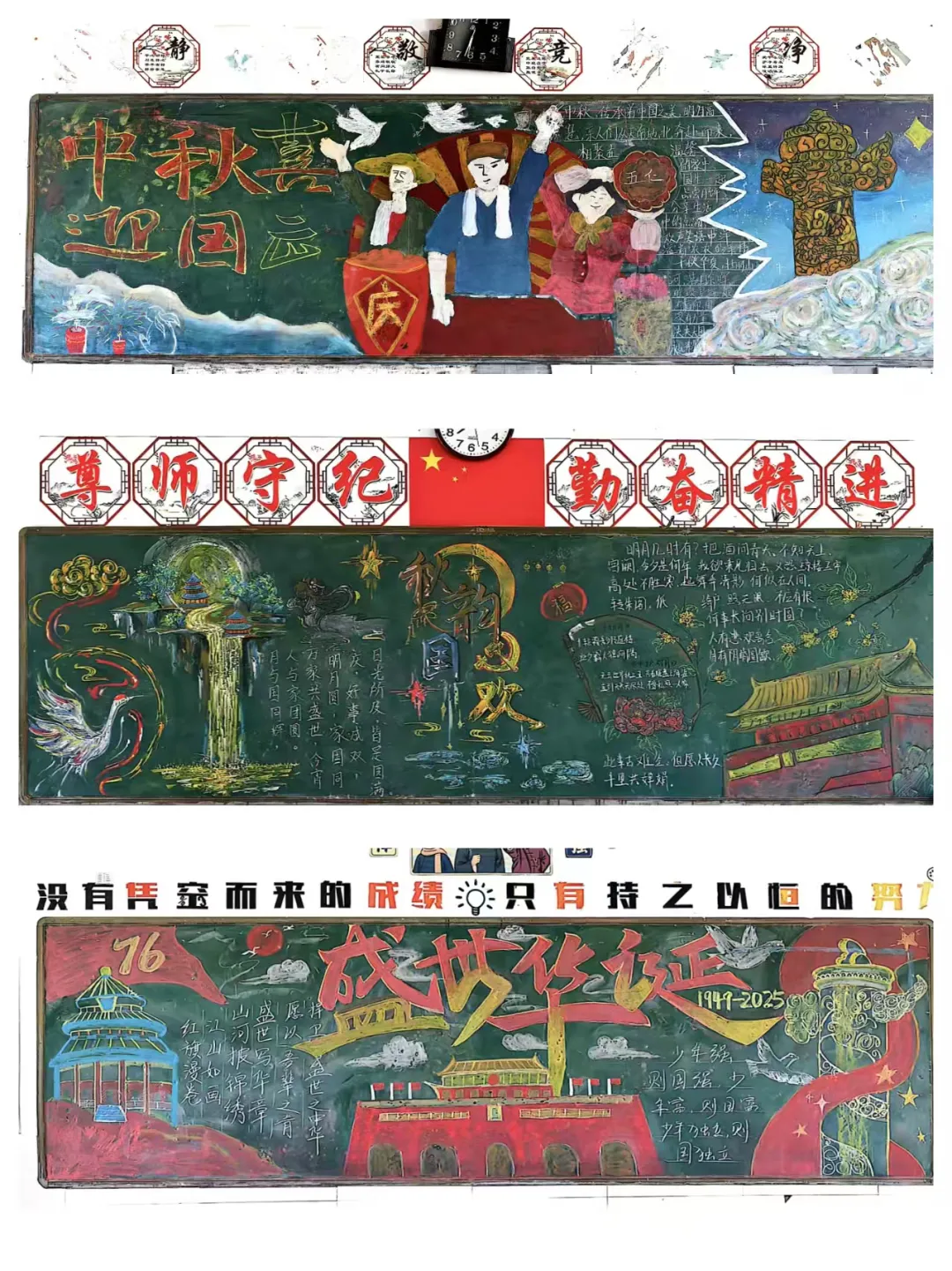 以评促学,德育美育共成长。本次评比由学校政教处、各班班长组成评审团,从主题契合度、内容丰富性、版面设计感、书写工整度四大维度进行打分。评审过程中,评委们对作品的细节打磨与创意表达给予高度认可:小学部作品充满童真,以明快色彩和卡通化的国庆、中秋符号,展现孩童对双节的直观热爱;初中部作品则更具深度,在版面布局、元素寓意上体现出对“家国同心”主题的深刻理解,不少班级还融入了“强国有我”的青春宣言,让黑板报成为思政教育的鲜活载体。