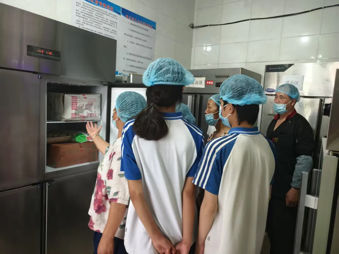 在后勤主任的引导下,家长们穿戴消毒衣帽后进入食堂操作间,依次参观蔬菜清洗区、烹饪区、备餐间、留样柜及食材仓库。工作人员详细介绍了食材验收、加工、留样等环节的标准化流程: