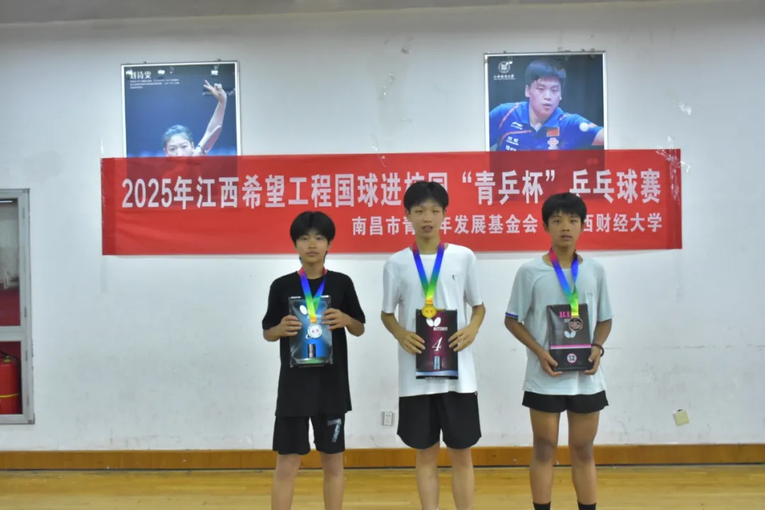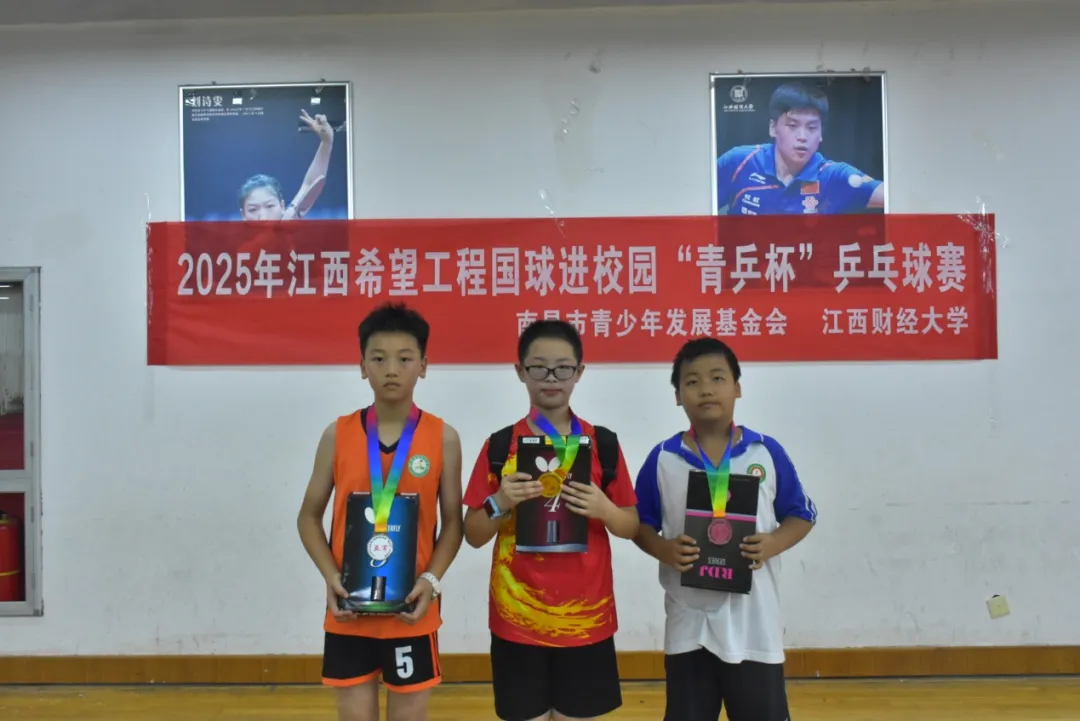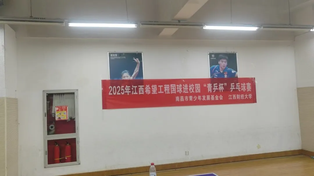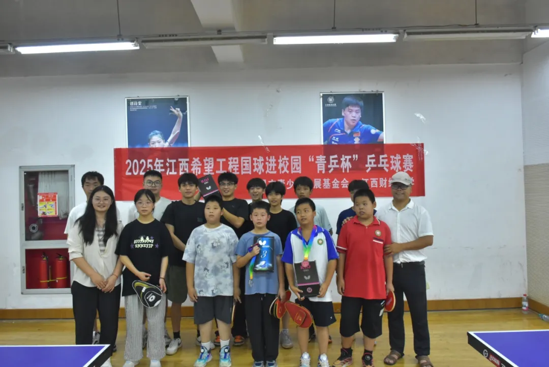 为深入贯彻国家体育强国战略,进一步推动乒乓球运动在乡村学校的普及与发展,激发青少年参与热情,浓厚校园“国球”氛围,助力青少年健康成长。2025年6月15日我校9名学生参加了南昌市青少年发展基金会在江西财经大学举办的“江西希望工程国球进校园‘青乒杯’乒乓球赛”。