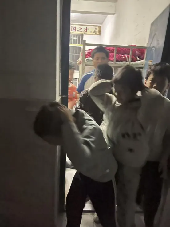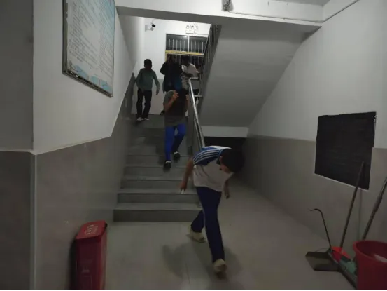 当晚,随着一阵急促的消防警报声划破夜空,演练正式拉开帷幕。本次演练不设脚本、不提前通知,旨在模拟最真实的火险应急场景。各宿舍学生在生活老师的指引下迅速反应,用湿毛巾或衣物捂住口鼻,低姿弯腰,沿着宿舍楼梯紧张而有序地快速撤离(如图1、2所示)。在光线不足的楼道内,同学们沉着冷静,整个过程忙而不乱,在预定时间内全部安全到达指定集结地点——学校篮球场。