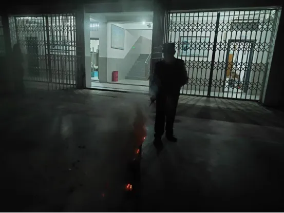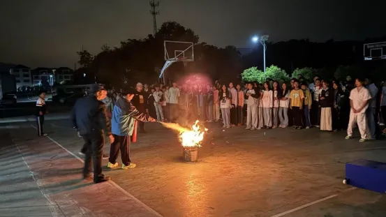疏散集结完毕后,演练进入关键的技能培训环节。学校安保人员在学校通道口设置了模拟火点,并现场详细讲解并演示了干粉灭火器的正确操作步骤——“提、拔、握、压”。随后,学生们踊跃报名,亲身体验灭火过程。在安保人员的指导下,多名学生代表勇敢上前,面对燃烧的火盆,冷静、规范地操作灭火器,成功将火焰扑灭。这“零距离”的体验让抽象的消防知识变成了具体的实战技能,给同学们留下了深刻印象。
