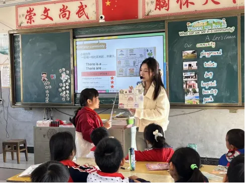 活动开始,乔乐学校的杨沪玲老师带来了一节四年级英语课《Unit 3: Places we live in》part A Let’s learn--our community。杨老师巧妙地将AI技术融入教学,通过乔乐社区实景图片、互动式板书等多媒体资源,生动呈现“playground, park, shop, hospital”等地点词汇,引导学生从乔乐本地社区出发,逐步拓展至更广的实际生活场景。