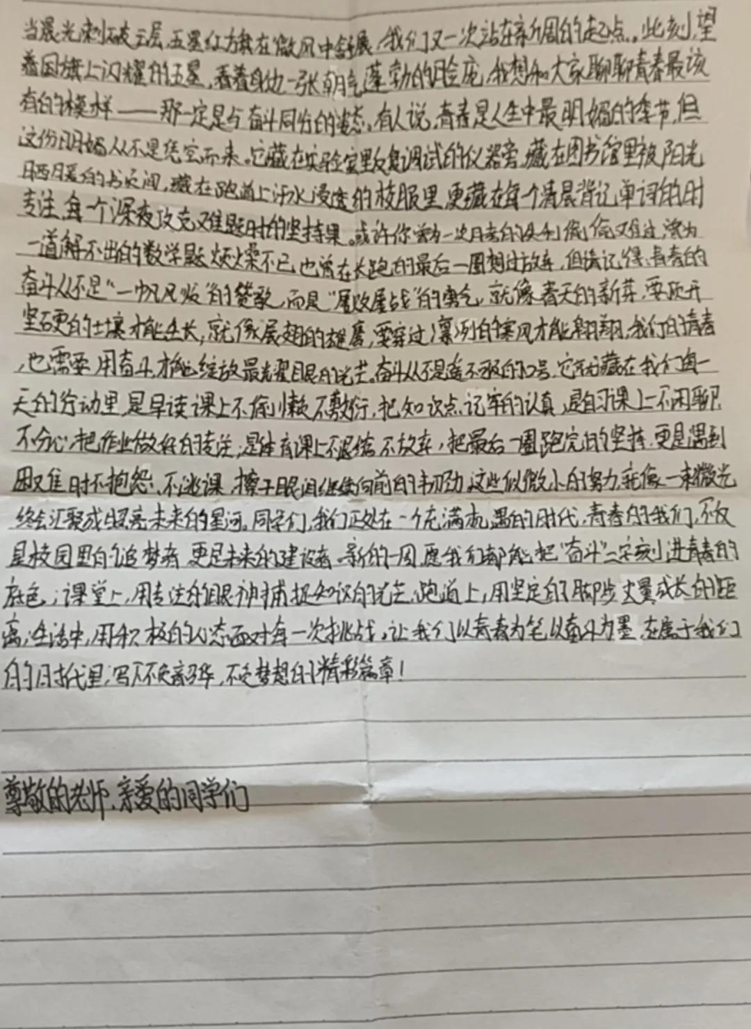 她进一步阐述,奋斗并非遥不可及的口号,而是藏在日常的点滴行动里。早读课上记牢知识点的认真、自习课上做好作业的专注、体育课上跑完最后一圈的坚持,以及遇到困难时不抱怨、不逃避、继续向前的韧劲,这些微小努力汇聚起来,终将照亮未来。